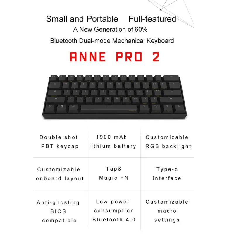 1 x Obins Anne Pro 2 60% NKRO bluetooth 4.0 Type-C RGB Mechanical Gaming Keyboard